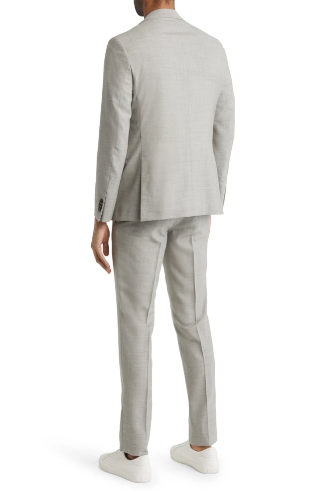 A navy-blue color adds dapper appeal to an Italian suit that’s styled for simplicity with flat-front trousers and classic notched lapels.